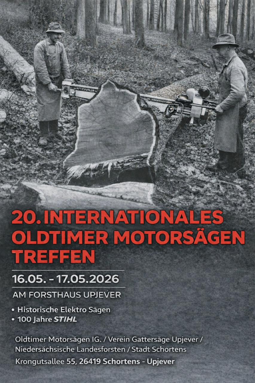 Nach dem großen Erfolg vor fünf Jahren kehren wir nun zurück in den Upjeverschen Forst. Damals wie heute ist das Ziel, ein lebendiges Museum der Motorsägengeschichte zu schaffen. Erleben Sie seltene Maschinen aus aller Welt – von frühen motorbetriebenen „Fuchsschwanz“-Sägen der 1920er Jahre bis zu den legendären ersten Kettensägen von Rinco, Dolmar, Stihl, Festo, Homelite, McCulloch, Husqvarna und vielen mehr.